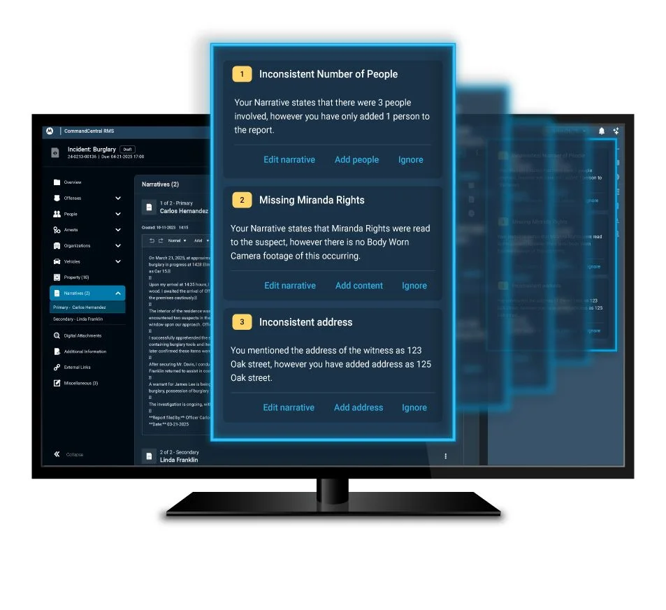 The public safety process is already complex. Randomly adding AI to everything, everywhere is not helpful. AI must not distract the user, bombard them with too many options or take precedence over the officer.